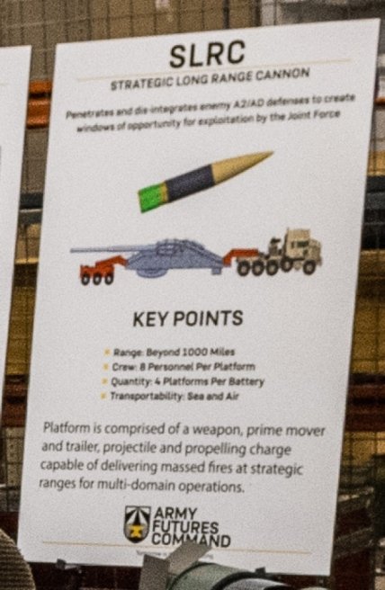 Если данные верны, то для нового комплекса частично применили решения, ранее использованные в американской 280-миллиметровой пушке М65. Речь идет о буксируемой пушке ядерной артиллерии США, известной как «Атомная Энни» (какой тип снарядов будет использовать SLRC — не сообщается). Комплекс мог стрелять на дальность примерно 30 километров, его общая масса в походном положении составляла 78 тонн. Всего с 1951 по 1953 год изготовили 20 пушек этого типа.