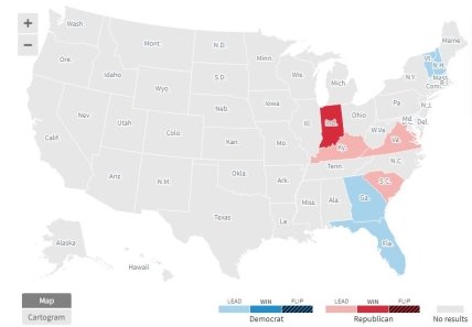 Для того, чтобы стать президентом, кандидату нужно набрать 270 голосов штатов. Победа в Индиане принесла в копилку Трампа 11 голосов. В остальных штатах ситуация еще может поменяться.