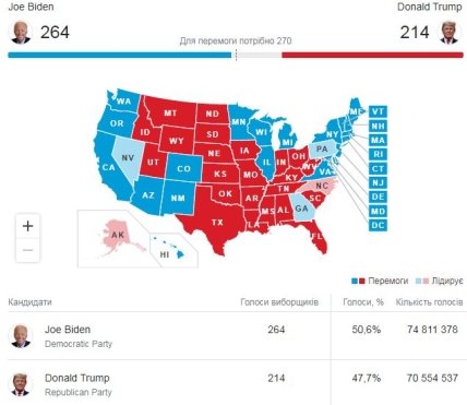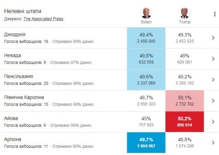 Бывший вице-президент также увеличивает шансы на победу благодаря голосам в Неваде и Джорджии. Он опережает Трампа более чем на 22 тысячи голосов в Неваде и опережает более чем на 4 тысячи в Джорджии. Подсчет будет затруднен в Пенсильвании из-за десятков тысяч бюллетеней, которые требуют особого внимания при подсчете из-за проблем с подписями или дефектами.
