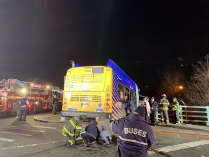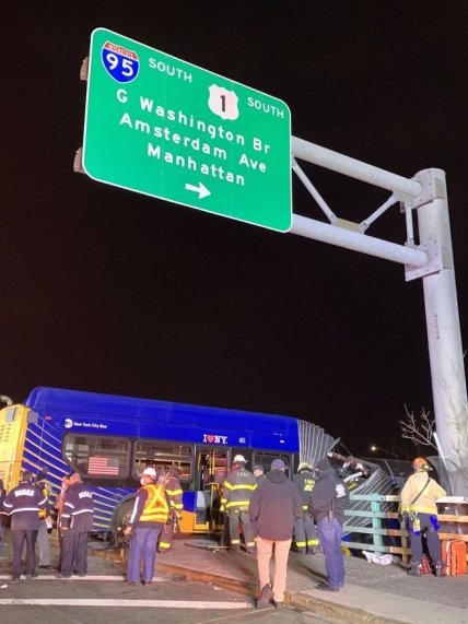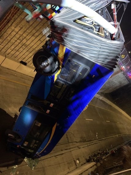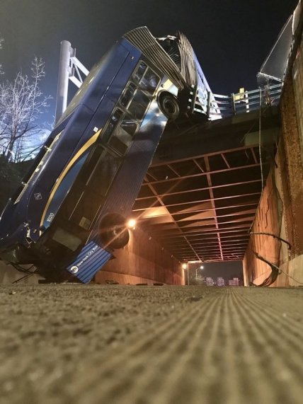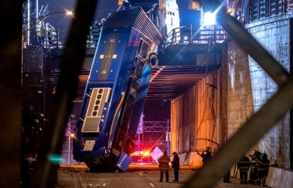 В Нью-Йорке пассажирский автобус-гармошка вылетел с эстакады и повис так, что его передняя часть оказалась на земле, а задняя осталась на эстакаде.