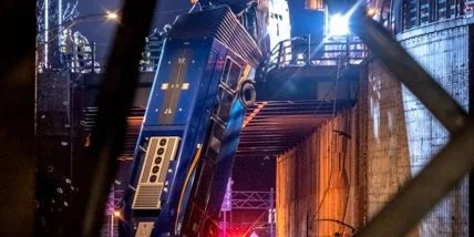 В Нью-Йорке пассажирский автобус-гармошка вылетел с эстакады и повис так, что его передняя часть оказалась на земле, а задняя осталась на эстакаде.