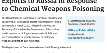 "Министерство торговли США расширит ограничения на экспорт в Россию в связи с отравлением химическим оружием", - говорится в нем.