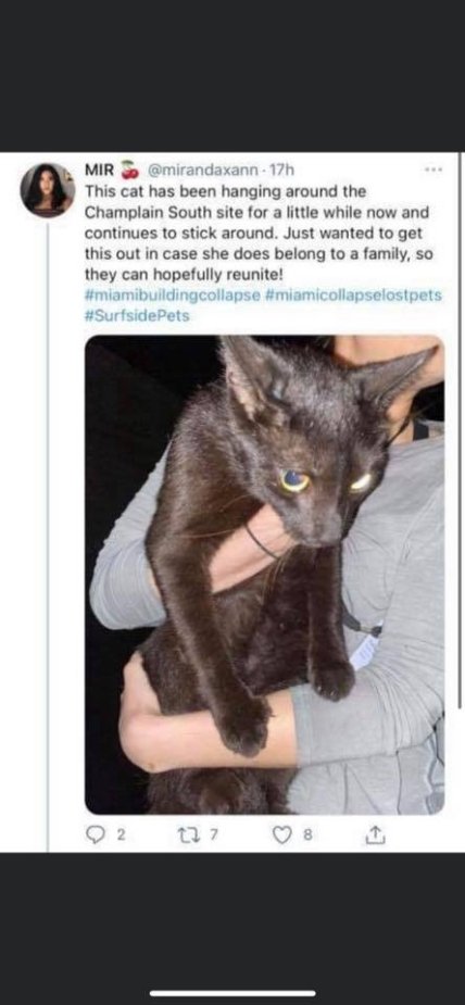 Source: “Binx” the cat, missing from Champlain Towers South unit #904 has been found & reunited with family. Cat somehow escaped building and was found near collapse site. #surfsidebuildingcollapse @wsvn pic.twitter.com/gOh0dMpRjY