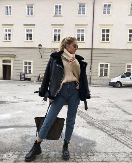 Такую верхнюю одежду можно сочетать с джинсами и свитерами, деловыми брючными костюмами, трикотажными платьями, кожаными вещами и элегантными юбками. По поводу обуви, то к дубленке отлично подходят грубые ботинки и сапоги-трубы.