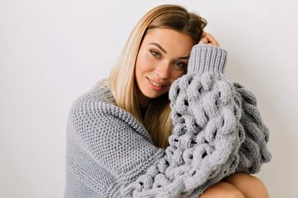 Красного многие побаиваются, но если взять красный внизу или в аксессуарах, то он влияния на лицо оказывать не будет. Да и серый снизит напор красного.