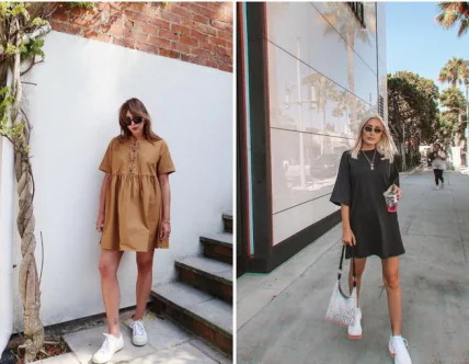 Отличительными чертами такого платья являются короткие рукава, округлый или V-образный вырез и прямой крой. Классический вариант — сочетать наряд с кроссовками, яркой сумочкой или рюкзаком, а также броскими солнцезащитными очками.