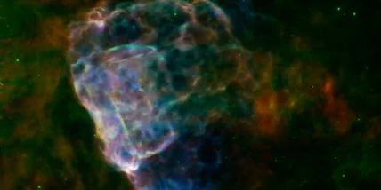 Такое облако пыли обозначено на картинке красным и зеленым цветом. Синим цветом, в свою очередь, обозначена материя, разогретая ударной волной до очень высоких температур. Такая материя дает излучение в рентгеновском диапазоне. Инфракрасное излучение помогло ученым установить объем материи, выброшенной в пространство взрывом сверхновой звезды.