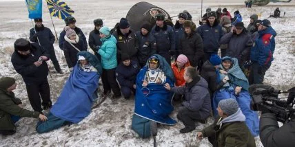 На представленном снимке космонавты запечатлены после эвакуации из спускаемого аппарата. Сообщается, что вместе с участниками этой экспедиции на Землю также было доставлено "космическое" поколение мушек Drosophila melanogaster. Дрозофилы были отправлены в космос для проведения экспериментов, связанных с изучением влияния повторного действия невесомости на многоклеточный высокоорганизованный организм.