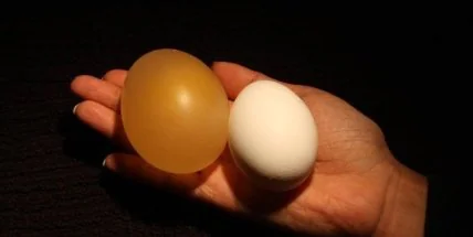 Под влиянием уксуса кальций, из которого состоит скорлупа, растворяется и исчезает в виде пузырьков газа. Получается забавное яйцо, которое выглядит как желе. Если же ставить эксперимент над варёным яйцом, то оно сделается упругим, как резиновый мяч.