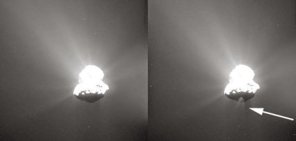 Комета 67P/Чурюмова-Герасименко по мере приближения к Солнцу начала активно сбрасывать свою материю в виде струй газа и пыли. Аппарату Rosetta удалось сфотографировать это явление, а снимки были показаны на прошлой неделе в Вене на Генеральной ассамблее Европейского союза наук о Земле.