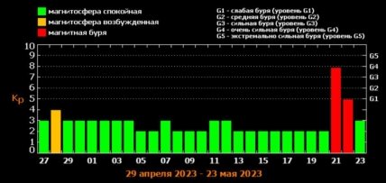 По данным Gismeteo, только в пятницу ранним утром, 28 апреля, ожидается слабая магнитная буря силой в 5 баллов.