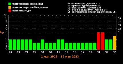 После того, как магнитное поле Земли вздрогнет от удара выброса корональной массы (СМЕ), через два дня — 25 мая — ожидается магнитное возмущение, которое достигнет мощности всего 4 баллов.
