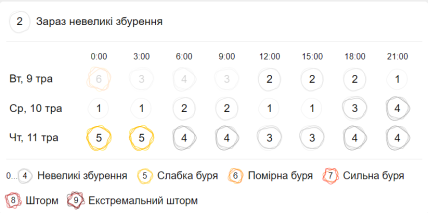 Ресурс Gismeteo демонстрирует графику магнитных бурь в ближайшие дни. По состоянию на 9-10 мая магнитные бури не зафиксированы, но магнитосфера Земли возбуждена. На следующий день прогнозируется слабая магнитная буря, мощность которой не будет превышать выше 5 баллов, но ближе к утру она сменится небольшим возмущением 4 баллов.