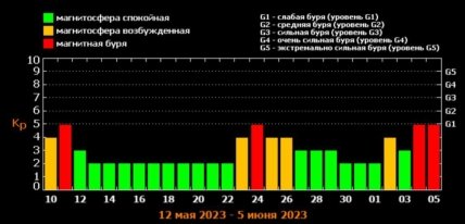 Между тем сайт Tesis.xras обнародовал обновленный график магнитных бурь в мае. Уже завтра, 10 мая, следует ожидать магнитного возмущения 4 баллов, которое на следующий день, 11 мая, сменится слабой магнитной бурей, мощность которой составит 5 баллов.