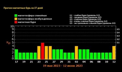 Как уже отмечалось ранее, на Земле продлится 6 дней тишины. После чего прогнозируется магнитное возмущение 4 баллов мощности — 23 мая. За ней последует слабая магнитная буря, 24 мая, и она составит 5 баллов мощности. Однако 25 и 26 мая ослабнет до магнитного возмущения 4 балла.