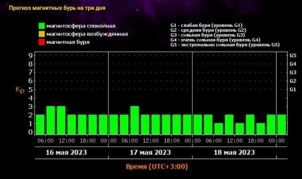 Ресурс Tesis.xras сообщает, что по состоянию на 12:00 16 мая магнитные бури не зафиксированы и магнитосфера Земли не возбуждена. Она будет в состоянии покоя и следующие два дня, 17-18 мая.