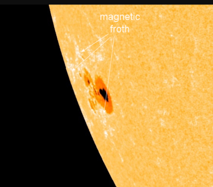 Большое солнечное пятно примерно в 3 раза шире Земли и окружено яркой пеной магнитной турбулентности, сообщает сайт Spaceweather.