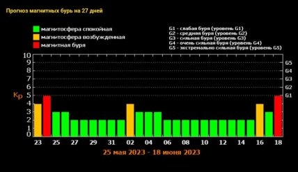 В первом летнем месяце 2 и 16 июня ожидается магнитное возмущение, а слабая буря мощностью 5 баллов – 18 июня.