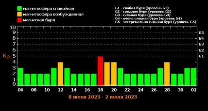 В то же время специалисты по ресурсу Tesis.xras обнародовали обновленный график магнитных бурь на июнь. По их прогнозам, ближайшая опасность, которая может угрожать магнитному полю Земли, — это небольшое возмущение 12 июня.