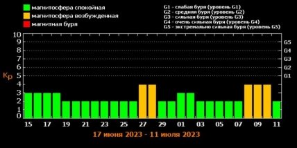 Также они подчеркивают, что во второй и третьей декаде июня магнитных бурь не предполагается. Следует ожидать лишь возмущения 4 баллов мощности, а именно 27 и 28 июня.