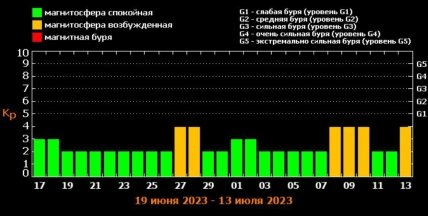 На сайте добавляют, что в первой декаде следующего месяца прогнозируется магнитное возмущение 4 баллов мощности – 8,9 и 10 июля.