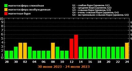 Между тем, работники солнечной лаборатории Tesis.xras демонстрируют график магнитных бурь на конец июня и июль.