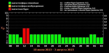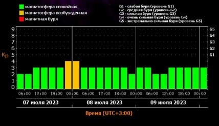 По данным Meteofor, в ближайшие дни, 7-9 июля, магнитное поле Земли будут беспокоить лишь небольшие возмущения 2-4 баллов мощности. Особенно максимальный уровень возмущения прогнозируется в пятницу с 18:00.