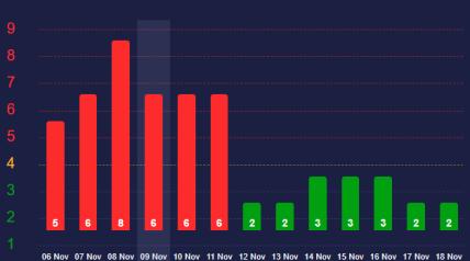 В то же время, астросиноптики с сайта солнечной погоды Meteoagent обнародовали график магнитных бурь и напоминают, что она держится на Земле уже 5 дней подряд. Ее максимальная сила за этот период достигала 8 баллов и произошло это 8 ноября.