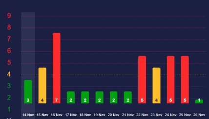 После того, с 17 по 21 ноября геомагнитный шторм не будет беспокоить поле нашей планеты. А уже 22 ноября возобновится буря 5 баллов, которая на следующий день снизится до небольшого возмущения, но уже 24 ноября увеличится до 5-балльной бури.