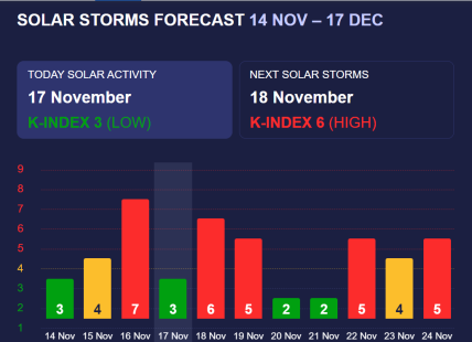 Однако в субботу, 18 ноября, геомагнитные колебания наберут силы — ожидается, что они достигнут 6 баллов. Это классифицируется как мощный геомагнитный шторм.