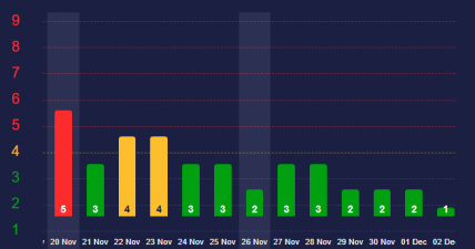 Согласно графику, магнитное поле Земли будет в состоянии возбуждения 22 и 23 ноября, однако эти колебания не являются штормом. После того, с 24 по 30 ноября, не предвидится каких-либо возмущений.