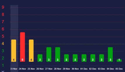Согласно прогнозу, сегодня, 23 ноября, будет царить геомагнитное колебание 4 баллов, которое на следующий день увеличится до магнитного шторма 5 баллов, однако уже 25 ноября его влияние уменьшится.