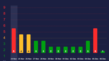 Согласно графику, в пятницу, 24 ноября, будет бушевать магнитная буря 5 баллов. В течение следующих двух дней магнитосфера нашей планеты будет в состоянии возбуждения.