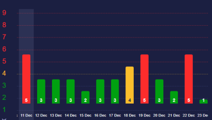 Согласно графику солнечной активности, 18 декабря прогнозируется небольшое возмущение 4 баллов, которое уже на следующий день, 19 декабря, перерастет в магнитную бурю 5 баллов, то есть слабую.