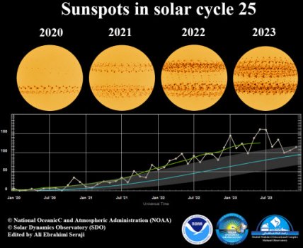 С начала 25 солнечного цикла в декабре 2019 года 782 группы пятен господствовали на поверхности Солнца. Около половины, а именно 361, появилось в 2023 году. Это можно посмотреть на инфографике: