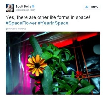 "Дебют первого в истории цветка, выращенного в космосе", - написал Келли."Да, есть и другие формы жизни в космосе!" - пошутил он под другим снимком. Как сообщили в НАСА, цветы астры-циннии были высажены в прошлом году на МКС в контейнере Veggie астронавтом Челлом Линдгреном. После его возвращения на Землю в декабре роль садовника взял на себя Келли. В частности, ему удалось удалить с цветков плесень, а также решить проблему подпитки растений водой, сообщает lenta.ru.