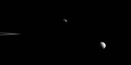Исследователи миссии Cassini опубликовали новый снимок спутников Сатурна Мимаса и Януса, которые расположились недалеко от колец планеты. Снимок был опубликован на официальном сайте NASA. Янус расположился по центру снимка, в то время как Мимас "завис" справа от него. Из-за неправильной формы Януса его терминатор (линия разделяющая светлую и темную стороны спутника) кажется неровным. Терминатор Мимаса напоминает прямую линию, что свидетельствует о ровной круглой форме спутника Сатурна.