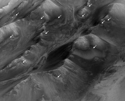 NASA показало снимки каньонов в долинах Маринера на Марсе, в которых, полагают ученые, периодически проступает жидкая соленая вода. Как сообщает агентство, научный инструмент HiRISE обнаружил 41 участок, на котором подозревается существование спадающих со склонов потоков жидкой воды: темные линии появляются в летний период и пропадают в зимний.