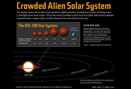 Вокруг звезды Kepler-80 пять экзопланет вращаются с периодами 1, 3, 4, 7 и 9 земных суток. Все они расположены к светилу в 150 раз ближе, чем Земля к Солнцу, и чрезвычайно рядом друг с другом. Четыре внешние планеты в 4-6 раз тяжелее Земли, а ближайшие в Kepler-80 небесные тела почти в два раза больше остальных, поскольку имеют огромные водородно-гелиевые атмосферы.