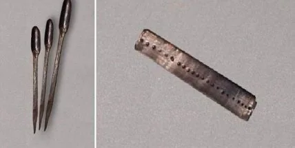 Компьютерное сканирование показало, что в ящике хранился набор из 14-ти инструментов. В частности, обнаружено несколько ложечных сверл и волочильная доска. В древности их использовали для изготовления браслетов.