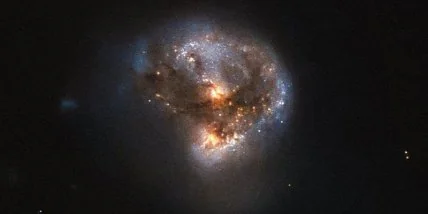 Черные дыры IRAS 16399-0937 удалены друг от друга примерно на 11 тысяч световых лет, и окружены скоплениями звезд. На снимке Hubble это - оранжевые области. Одна из черных дыр, находящаяся в более спокойной части галактики, обладает очень высокой массой - она примерно в 100 миллионов раз тяжелее Солнца. Как отмечают в NASA, весь газ в этой галактике был сильно "взболтан" и перемешан, благодаря чему сейчас в ней формируется огромное число звезд. Когда эта вспышка звездообразования завершится, IRAS 16399-0937 фактически превратится в космического "зомби", так как все ее запасы холодного газа будут исчерпаны.