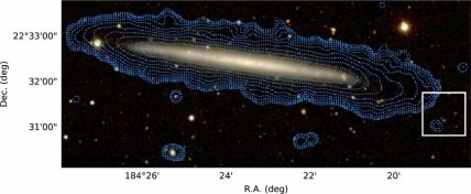 На рисунке внизу показана галактика UGC 7321. Пунктиром отмечено распространение флюоресцирующего газа.
