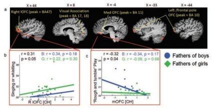Фотографии сыновей вызывали выраженную активацию (в таламусе, медиальной орбитофронтальной коре, нижней височной борозде) при условии нейтрального выражения лица, тогда как печаль нивелировала половые различия. Согласно анализу аудиозаписей, отцы уделяли дочерям больше внимания: они чаще пели и насвистывали мелодии, использовали понятия, связанные с грустью и языком тела. В общении с сыновьями мужчины были более склонны к жестким контактным играм и апелляциям к сфере достижений. Дополнительно авторы сопоставили поведение испытуемых с активностью мозга. Выяснилось, что у отцов дочерей пение положительно связано с активностью в латеральной орбитофронтальной коре, а склонность к контактным играм — с подавлением левой лобной извилины.
