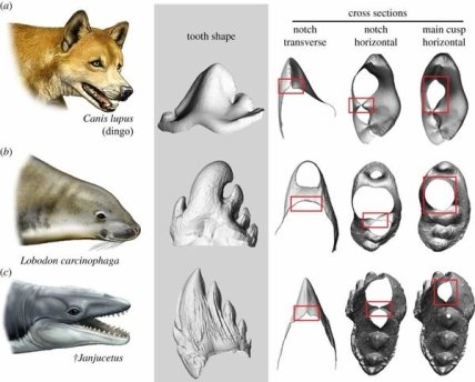 В исследовании приняли невольное участие четыре представителя современных ластоногих, четыре — современных сухопутных хищников и восемь окаменелостей древних китообразных. Результаты оказались неожиданными. Древние киты, предки мирных усатых увальней, имели острые зубы в целом того же типа, что и современные хищники. Представить себе процеживание воды через них довольно затруднительно, перед нами — арсенал активного охотника, предназначенный для захвата, удержания и кромсания добычи.