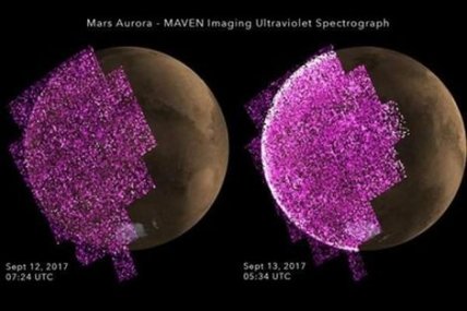 Американские специалисты полагают, что мощное сияние на Красной планете было вызвано солнечной бурей, которая прошла 11 сентября.