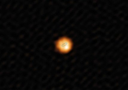 Самое детальное изображение красного гиганта: W Гидры расположена в 320 световых годах и на несколько миллионов лет старше Солнца. Пунктирный круг приведен для сравнения и показывает размеры земной орбиты (1 а. е.) / ©Alma, W. Vlemmings