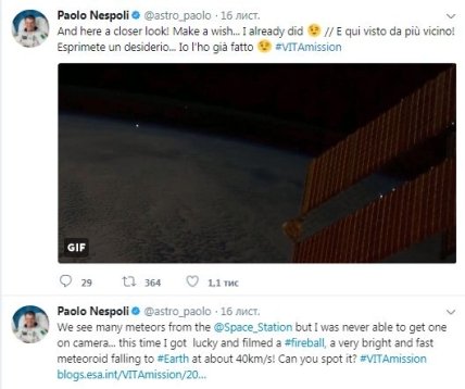 Запись он опубликовал в своем Twitter, по мнению космонавта неизвестное тело было метеоритом.