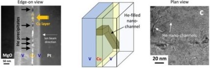 Решением проблемы, связанной с гелием, является специальный нанокомпозитный материал, стоящий из нескольких тонких металлических слоев. При накоплении гелия в таком материале образуются нанопоры, подобные самым тонким сосудам кровеносной системы. Через эту нано-кровеносную систему гелий, который совершенно безопасен для окружающей среды, начинает беспрепятственно просачиваться из камеры реактора наружу. Это препятствует накоплению гелия, образованию пузырей в металле и разрушению металлических деталей камеры реактора.