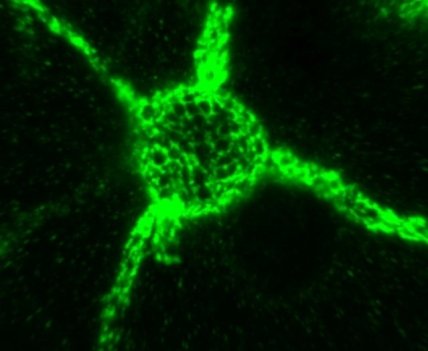 Молекулы перинейрональной сети, покрывающие нейрон, окрашены зеленым