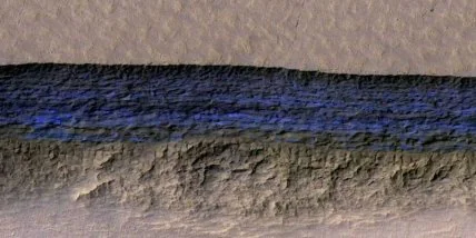 Авторы новой работы пришли к выводу, что и в средних широтах лед может выглядывать из-под твердой поверхности планеты. Этот вывод основан на результатах наблюдений автоматической межпланетной станции Mars Reconnaissance Orbiter (MRO). Ученые обнаружили восемь мест в средних широтах Марса, где лед выходит наружу. В этих точках возвышаются отвесные утесы, отчасти разрушенные эрозией. На сломе утесов на снимках виден голубой лед с заметными слоями. Исследования с помощью спектрометра CRISM показали, что в составе фрагментов присутствует вода, покрытая очень тонким слоем пыли.